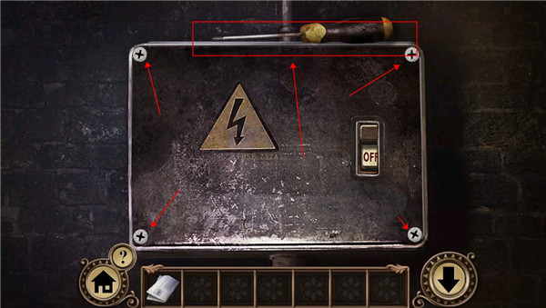 2、然后点击旁边的电箱,上面有个螺丝刀,用螺丝刀将四个螺丝卸下来,我们可以看见保险丝烧断了