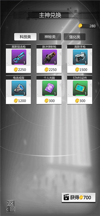 7、在主神界面中你可以使用金币兑换各种武器道具,也可以在轮回小队中使用金币解锁更多角色