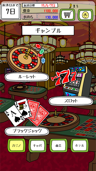 欠债要靠赌博来还2是一款策略经营的休闲益智类游戏。也是该系列最新出的续作。玩家作为一位不爱上班,偏爱赌博,更爱陪酒女,没钱借钱,导致负债累累的成年男性。玩家可以通过赛马,拉霸机,购买彩票和刮刮彩赢钱。工作就输了,可是还想玩,没钱花去借就行了,赌赢之后再还钱就好。明明负着债,却超喜欢赌博,超喜欢陪酒妹,可是无论如何都不愿去工作。如果真的没钱了,还能让老婆去打工挣钱,无论如何也不想工作的男人,玩玩闹闹就把欠债还清的游戏。每过七天讨债鸟人就会上门要求偿还一部分债务,在还债日之前通过赌博准备好这部分现金吧。如果还不上的话,赌博渠道有赛马,拉霸和彩券。但是有一些不一样的地方,赌博赢了的时候,就去夜店找陪酒妹尽兴吧。是通过赌博,咸鱼翻身,还是越赌越输,走入地狱,还是越赢越多走上人生巅峰,一切都看你的选择。游戏特色