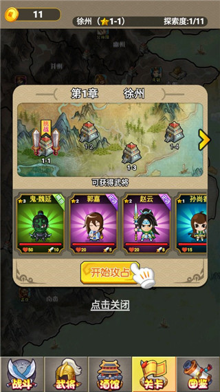 2、这里有战斗、武将、酒馆、关卡、图鉴等板块;