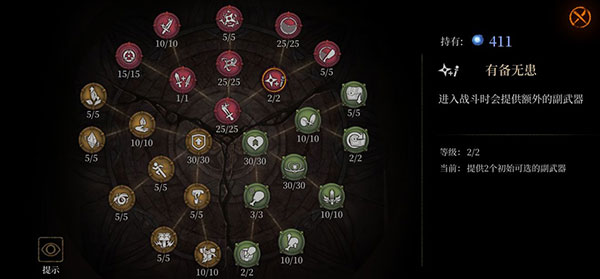 3、第二选择和有备无患。这两个天赋是开局会提供两把武器和两个副武器选择,选择性更强,可以随意搭配。