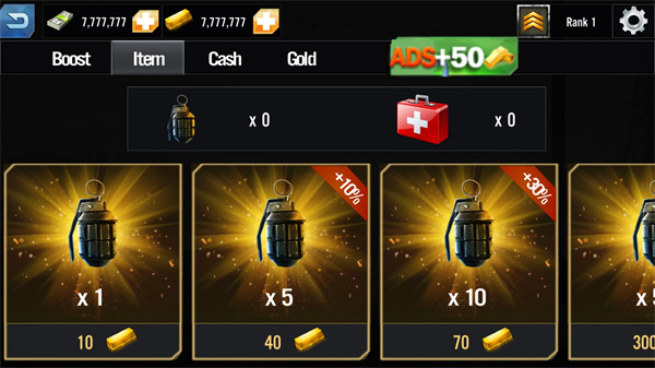 2、在开始战斗之前,当我们有足够的金币时可以先进行购买一些装备,点击手榴弹旁边的加号;
