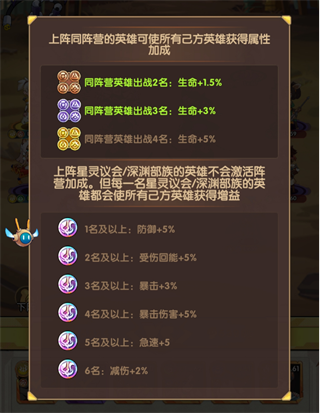 3、除此之外,需要了解阵容的加成效果有哪些。在游戏中我们区分为两类加成效果:属性加成和阵容加成。属性加成就是我们所说的聚能兽加成效果,而阵容加成顾名思义就是同阵容英雄出场的加成效果。