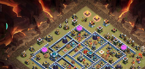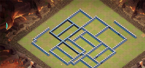 阵型解析:这是一个大本偏置的不规则格子阵,呈菱形的放置方法,大本与中心区域隔开放置。这种格局是一种比较常见的防守放置,对于陆军来说是需要弹跳或者地震才能穿透这个阵型的。火塔处均分散开,其中埋5电塔防止清边和引导部队走偏,也可以坑人。实测非常好用,适用于一般的部落战。