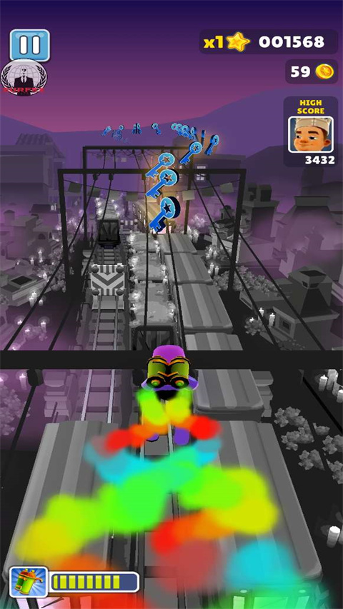 玩家在地铁跑酷小雾神专属版本内化身我们的主角杰克,在三条铁轨中穿梭,迎面将会驰来列车和出现各种障碍物,需要靠玩家快速的反应力,在躲避警察和猎犬的追捕的同时收集钥匙,以获取更高的分数,要注意被警察和猎犬赶上就Game Over咯。游戏内的有多种道具帮助你跑得更远、收集更多钥匙,例如飞行背包、弹力棒、滑板等趣味性道具。感兴趣的小伙伴快来本站下载游玩,开启你的地铁跑酷逃亡之旅吧!