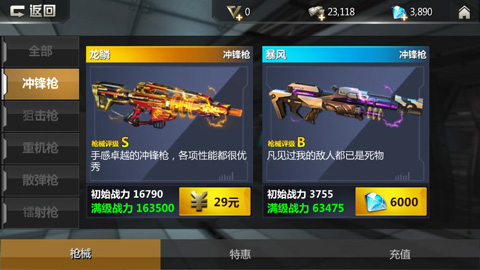 武器是游戏中最重要的东西,获取方式有两种:一种是从商城直接买,用钻石很快就能拿到;另一种是收集武器碎片,虽然比较慢,但能省点钱。玩这个游戏,不仅要武器好,战力也要高,主要通过枪械强化、升星和防具升级来提升战斗力。