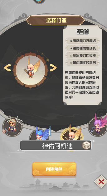 2、『圣僧』:攻击力偏低,气血中等,防御高,出手速度中等。圣僧又名和尚,主要追求生存能力的体现,纯奶妈职业,此职业拥有的技能可是逆天的,前期和尚绝对是一等一的抢手货,救死扶伤的神圣存在。建议30级前全加力量,30级后可适量加少血气血。