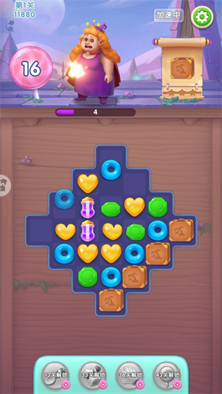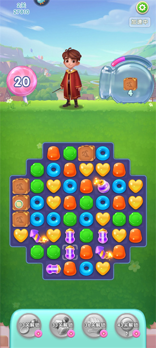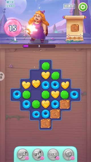 在消除玩法上抛弃传统的指尖滑来滑去的单纯玩法,融入了许多策略元素和军旗的规则,如果你只是考虑当前步奏,可能在规定的步奏之内,是很难消除够规定的糖果数。而当你划一步能顾及到后面一步或几步的话,就很有可能出现连消或大面积消除的激情场面,完成目标通过关卡,是很轻松的;再比如有巫婆的关卡,巫婆会根据你走的步奏优劣触发她释放诅咒,诅咒会将糖果给冰封,给你消除带来麻烦和障碍,让你举步维艰,所以在消除的时候,一定要做到尽量阻止巫婆释放诅咒。