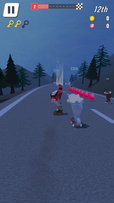 3、游戏模式为闯关挑战,每一关都有数量不等的对手,并且道路的复杂程度也远超想象。竞速对抗期间,玩家需灵活走位,同时也别忘了拾取道路上的金币、钻石等资源。
