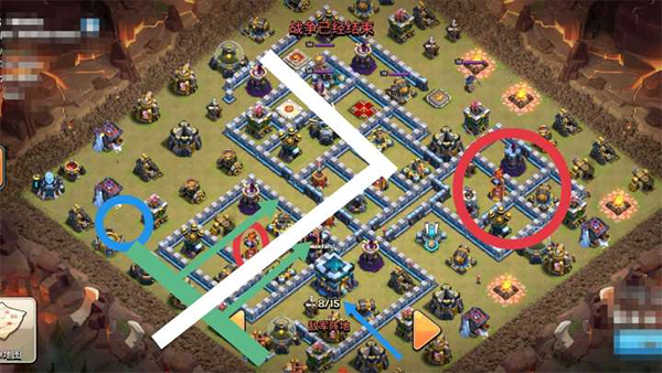 只需要处理右边的多头塔,左边的单头塔有冰冻法术可以预防天女被秒。冰人配合飞盾战神破解多头岛,蛮王配合法师清理左上方零散建筑,就很完美的做出了矿猪标准的L字型。