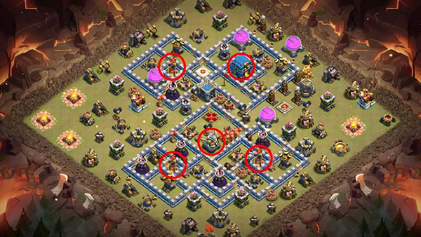 法师塔靠外组成防御链,让蝙蝠的威胁大大降低。大本营用多层城墙包围起来,可以有效分流对方部队,也能起到很好的防御作用。