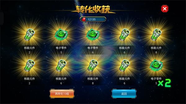 资源转换里面有三个转化选项,主要是用来转化出核能能元件、幽能元件和奥能元件,但也有几率转化出高能组件和电子零件。推荐用第一个来进行转化。因为第一个需要的钻石最少,转化10组仅需要45钻石。而且出电子零件的几率很大,双倍的几率也是很可观的。
