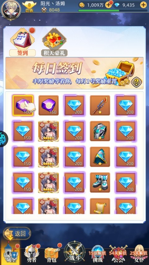 1、天天领豪礼,第1天:钻石*200、寻宝券*10!明天再送5星传说勇者!