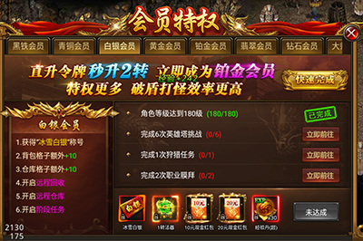 d、在前期想体验快速推图快乐的玩家,那么购买直升大礼包绝对是不二之选,直升大礼包可以免去大量的任务直接升到2转、解锁铂金会员、解锁三英雄并且获得英雄加速秘籍,铂金会员领取的三转法器以及解锁的三英雄,能够让你拥有挑战世界boss的资本,优先获得极品装备的可能。