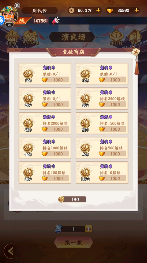 3、每次挑战对手后,获得声望或其他资源,声望可以用于购买演武场商店的中的道具。