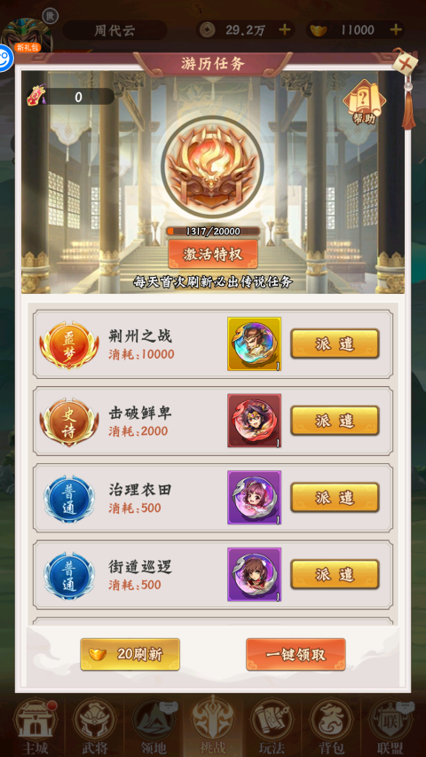 1、派遣任务每天0点自动刷新,分为简单,普通,困难,史诗,传说,噩梦六个级别,级别越高奖励越丰富,可消耗元宝进行任务奖励刷新。