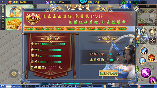 4、另外,游戏内的20级VIP会员只需击杀20只怪物就可以领取;
