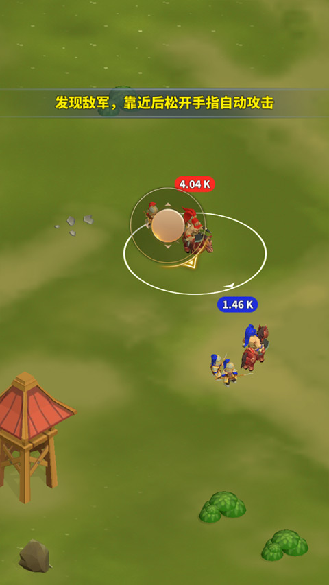 2、招募到小兵之后会发现敌军,玩家控制人物靠近敌军后松开手指自动攻击!