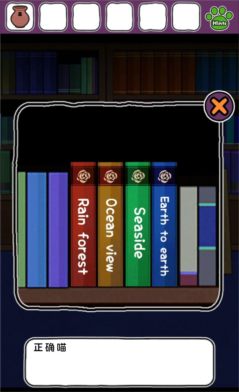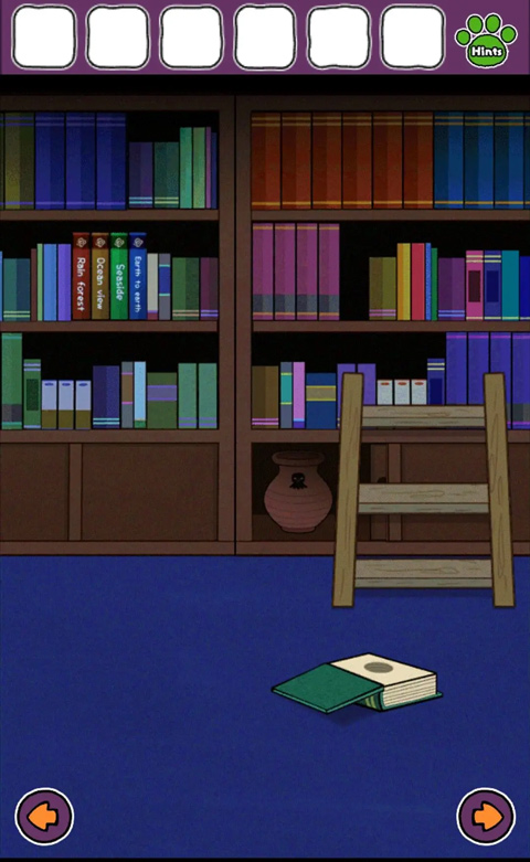 4、进入下层后直接向右,到达全是书的房间,打开书柜底部,获得画着章鱼的陶罐。