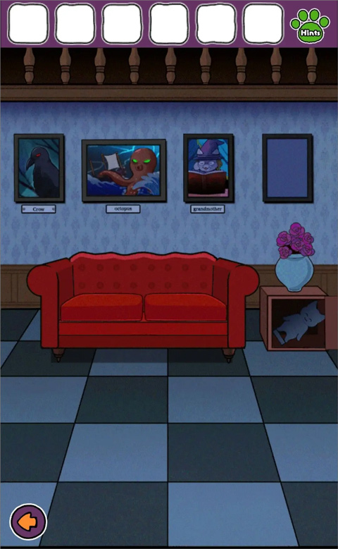 26、返回有红色沙发的房间,把有门的画放到最后一张空的画框中,返回密室最里侧,点击开门,游戏通关。