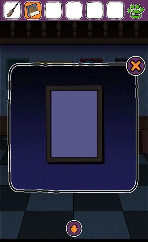 12、返回最初的房间,用螺丝刀把左侧的灯卸下来,向右到达有红色沙发的房间,点击第一幅画,用螺丝刀卸下铭牌,获得刮刀。