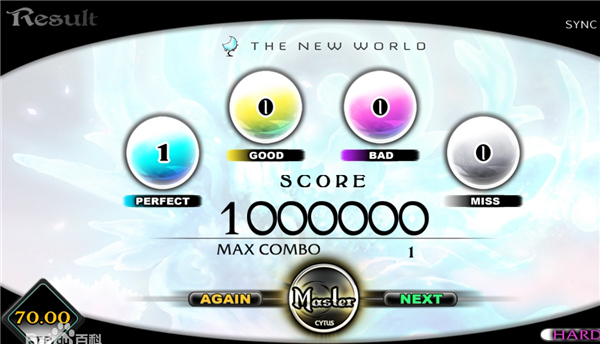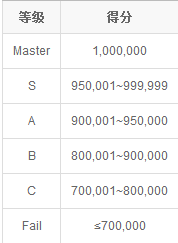 而每首曲子完成后会根据得到的总分来评定等级。共有六种等级,由好到坏依次为:Master、S、A、B、C、Fail