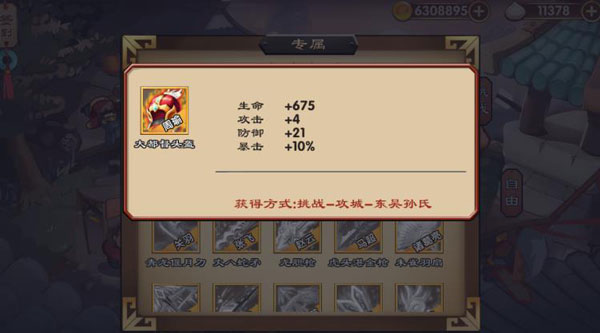 例如:周瑜要是解锁大都督头盔即可获得生命、攻击、防御和暴击加成!