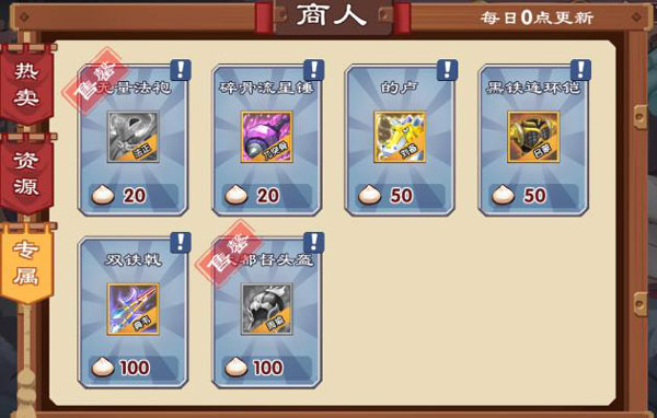 1、专属商店:点击右上方的“+”号选择“专属”即可购买到一些专属,但每天只刷新1次。