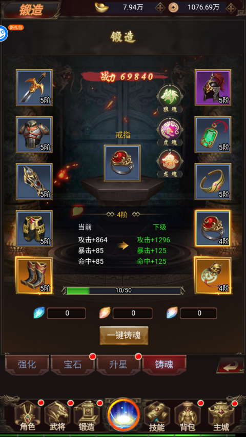 在锻造-铸魂中吞噬孤狼、猛虎、飞龙之魂来提升角色属性,通过神将阁寻宝可以获得三种魂,也可以使用从魔神吕布玩法中获得的铸魂石来铸魂。