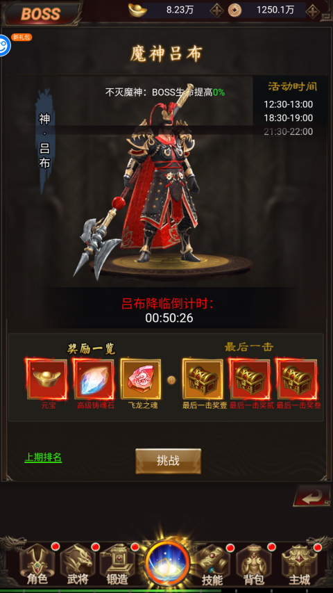 共3个BOSS:吕布,真·吕布,魔神吕布,BOSS被击败后依次出现,每个BOSS被击败后全场景玩家可获得奖励,最后一击击败BOSS的玩家可获得最后一击奖励,根据对BOSS造成的总伤害排名。