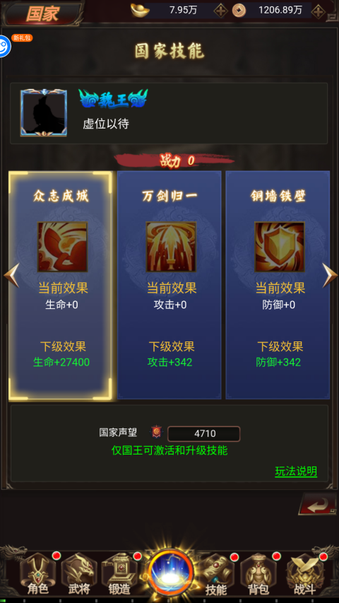 仅国王可激活和升级国家技能,国家技能一经激活,永久存在,全国成员可共享技能属性,激活和升级技能需消耗国家声望,国家声望为全国成员声望之和,更换国王不影响国家技能的激活和升级。