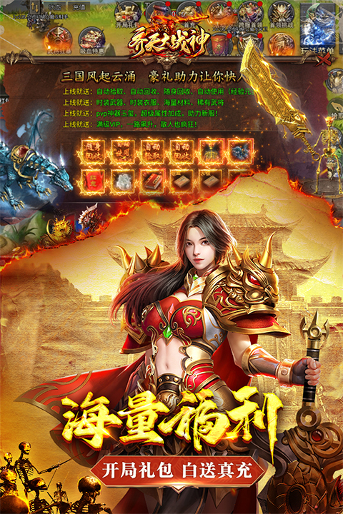 1、上线领取开局礼包,免费送满级VIP、时装武器、海量材料、强力技能召唤武将