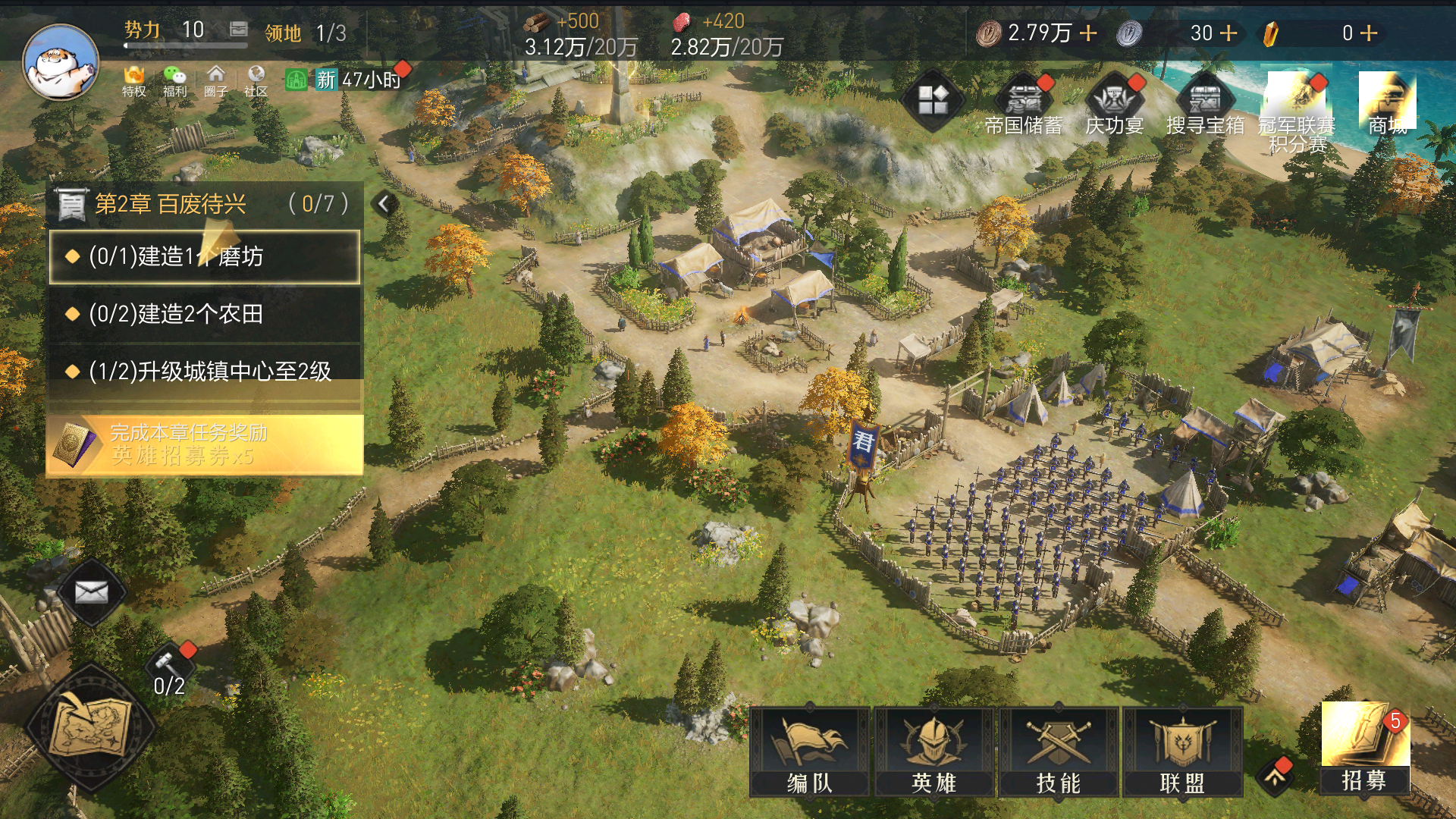 新手推荐了几种实用阵容,比如红颜弓、连击骑和反击枪,这些队伍配置简单且强力,适合新人玩家练习使用。游戏中还有探险模式,玩家可以组建探险队进行寻宝,获取资源和内政官提升道具,进一步增强自身实力。