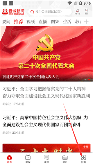 1、打开晋城新闻网app,进入首页后点击下方选项中的“服务”模块;