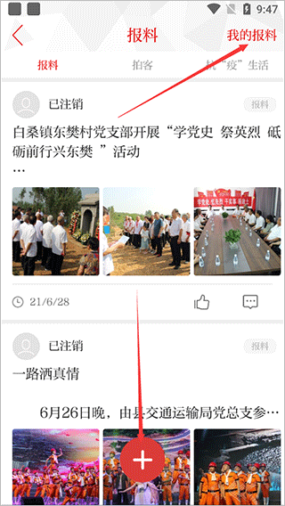3、“爆料”页面我们可以查看到别的用户的爆料信息,点击下方的“+”按钮即可编辑爆料发布,点击右上角还能查看自己所有的爆料。