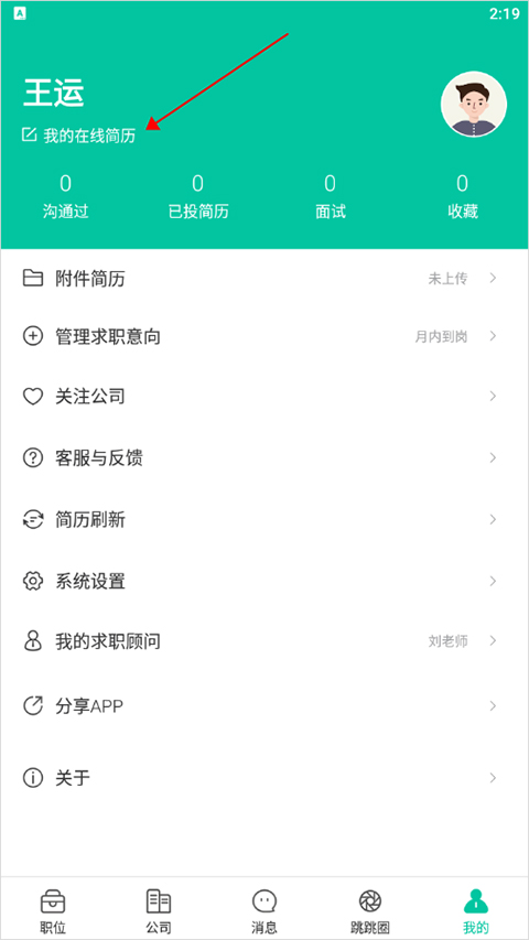1、用户登录软件后可以先进入【我的】页面中点击页面顶部的【我的在线简历】