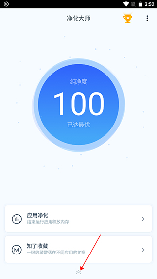 1、打开在本站下载的净化大师app,进入主界面后,即可以看到当前系统的净化状态。在页面的底部,列出了今日的净化记录,点击这儿可以进一步查看具体的详情。