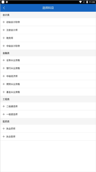 当前版本科目类型包含会计类、金融类、工程类和医药类,在相应的科目下还有针对不同专业提供的题库训练。