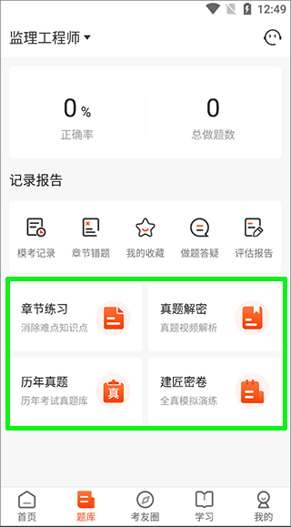 1、首先,打开软件,在题库界面找到并点击绿色方框内的功能区域,这里选择的是章节练习点;