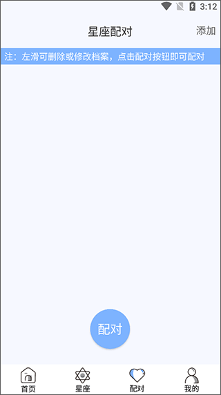 1、打开星座屋手机版,在配对一栏找到并点击“配对”按键;