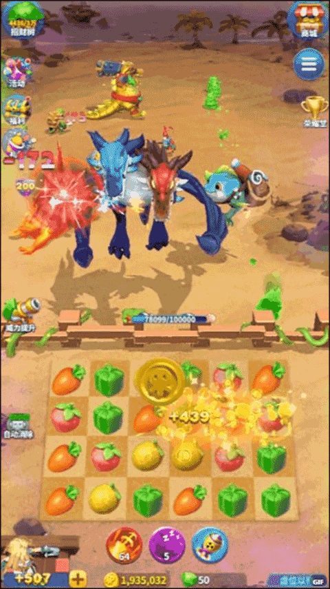 1、快速消除!每次消除都有几率生成水果弹攻击海妖,并有几率直接将其杀死。