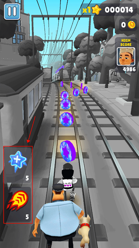 5、注意不同的动作可以躲避不同的障碍物,比如迎面而来的火车我们就需要跳向一旁躲避,如果不小心被撞到就会游戏结束,此外游戏中我们可以使用道具来辅助游戏,比如刚开始游戏时,在左边会出现两个选项,也就是加速选项,只要有加速道具,点击人物就会加速前进。