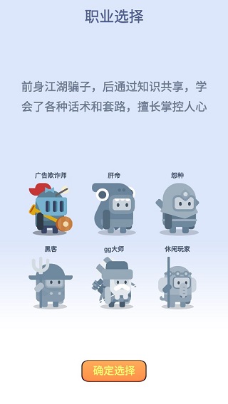 目前提供的职业包括:广告欺诈师、肝帝、怨种、黑客、gg大师和休闲玩家。