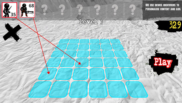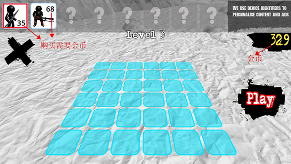 2、玩家选定上方要购买的火柴人之后,点击下方蓝色框框即可上阵火柴人,摆好阵型点击play即可开始游戏,如果觉得阵型不好,玩家可以点击左上角的X,重新摆阵,当然也是需要尽量把远程兵放到后排,并且用近战兵将他们包围起来,保护好主力输出。
