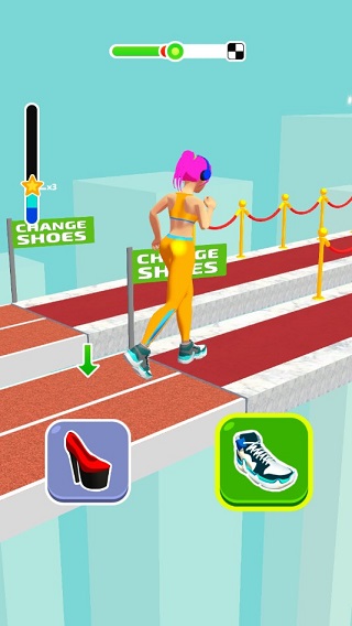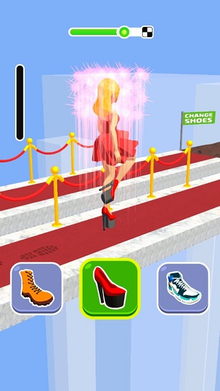 游戏玩法将关卡与选择相结合,每个关卡中都设置了多种不同属性的路面,分别对应着玩家可以选择的三种鞋子,玩家需要通过在对应的道路上选择相关的鞋子提高角色前进的速度,红毯上的高跟鞋、跑道上的运动鞋以及沼泽里的靴子等,角色在玩家选择对应鞋子的时候还会换上与其匹配的服装,在细节方面令人称道。