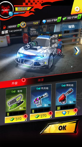 游戏中大家除了要掌握技巧玩法以外,赛车的改装也至关重要,升级装甲、机关枪和侧机枪可以让你在关卡中披荆斩棘一往无前,同时更换车辆皮肤还能迎合你的所好。