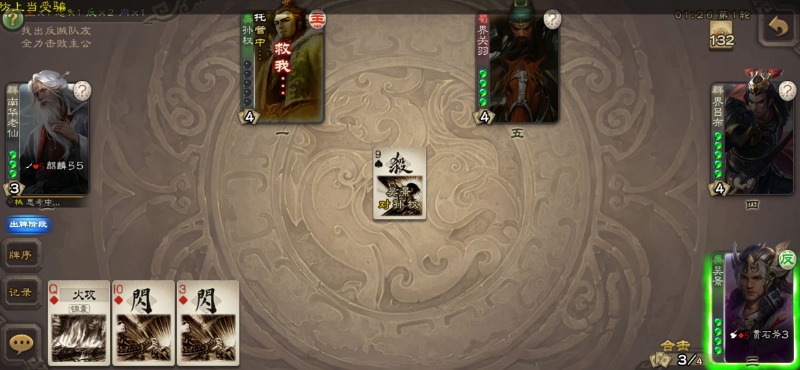 反:推荐看开局的站位,今天有一局队友站位较优加上开局刷牌加成第一回合直接秒了主我都惊呆了,军争还是很吃队友位置和手牌的。队友靠近主刷红杀配合合击能打一波爆发。