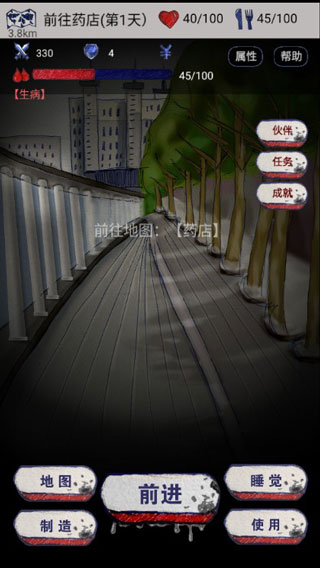 游戏中的生存挑战包括食物短缺、丧尸威胁以及自然灾害。玩家需要谨慎管理体力和资源,在必要时通过睡觉恢复能量。战斗模式有“拼命战斗”和“谨慎战斗”,分别提升伤害或降低风险。