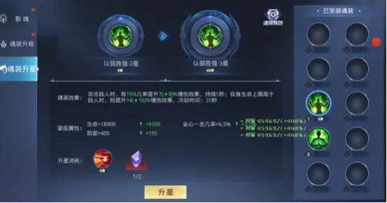 2星或以上的魂装还可以进行升星,升星需要消耗2星魂装和影魂精魄进行提升,建议玩家把多余的1星魂装分解,2星魂装用来进行升星,升星可以大幅提升魂装属性!