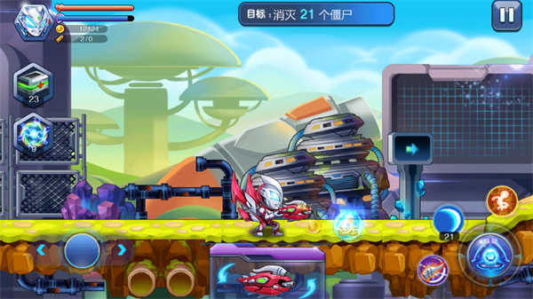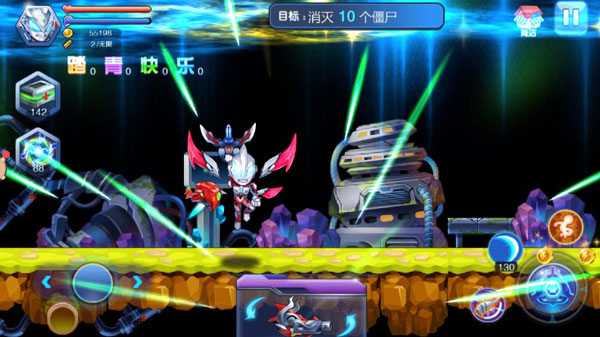 玩法方面比较的简单,左侧移动,右侧攻击(包含近战攻击/武器设计/技能)和跳跃,只要简单的熟悉运用一下即可,而且左上方的补给和全屏秒杀技能也十分炫酷,绝对能亮瞎你的眼球。